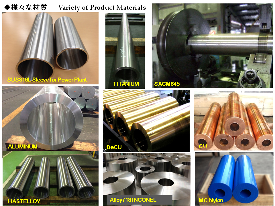 通常の一般鋼やSUS316などのステンレス鋼はもちろんのこと、チタン、アルミ、窒化鋼、ハステロイ、インコネル、銅、ベリリューム銅、MCナイロン他樹脂製品などの実績があります。また、様々な試作も行わせて頂いております。材料調達から内外削、熱処理そしてホーニングもお引き受けいたします。お気軽にお問合せください。